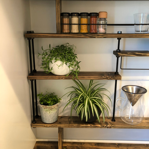 | 商品の特徴 | 地震でも倒れない突っ張れるキッチンラックCentralスパイス収納。地震でも倒れない突っ張れるキッチンラックCentralスパイス収納☆ 耐震。地震でも倒れない突っ張れるキッチンラックCentral☆スパイスラック。地震でも倒れない突っ張れるキッチンラックCentral☆☆スパイスラックこちらのキッチンラックは突っ張れる仕様なのでガタつきが無く、耐震仕様となっております♩カラー名//木目強調 ダークウォルナットシックなカラーです!カウンターキッチンの隅やコンロの隙間、窓枠など多用途でご使用出来ます◡̈❁写真はあくまでも例ですのでお好みの場所で使って下さい(´∀`*)ボルトを長めに設定しておりますので中棚はお好みの高さで変えて頂けます^ ^負荷が掛かる場所には転倒防止アジャスターもオプションにてお付け出来ます☆細かいペーパーで加工しているので天然木なのにスベスベです♩サイズ幅 90cm高さ 82cm奥行き 9cm高さオーダー無料キャンペーン中!最下段のみ奥行き縮小オプション+1000円上段のスパイスラックは落下防止金具付きで安心!右棚はS字フックを付ければキッチンカトラリーを吊るせます♩上段棚はマイナス5cm前後で自由に調整可能にしておりますのでぴったりにしたい時や微調整が可能です♪こちらは、組み立て式ですボルトを締めるだけですので非常に簡単です。#アイアンシェルフ#キッチン収納#グリーンディスプレイ#キッチン小物#観葉植物#食器棚#スパイスラック#フェイクグリーン#すき間収納#すきま収納#収納ラック#木製食器棚#木製スパイス棚#収納棚#スパイス収納#ウィンドウディスプレイ#出窓インテリア #ブルックリンスタイル#男前インテリア#北欧ナチュラル#ナチュラルインテリア。地震でも倒れない突っ張れるキッチンラックCentralスパイスラック 地震。小学生以上ならお子様と一緒に組み立てられそうです(^^♪初心者の方でも分かりやすい説明書付き!エイジング加工やビンテージ加工を施したハンドメイド品ですのでわざと色ムラをつけたり、傷をつけています!ご理解頂いた上でご購入お願いします♪※写真に写っている小物はつきません。ステンレスキッチンラック オグレ O'gre Sサイズ ウォールシェルフ 食器棚 | ||