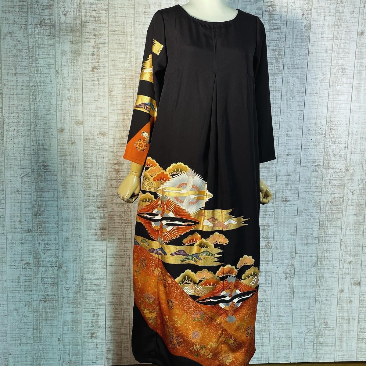 | メーカー | 着物リメイク 黒留袖 ロングワンピースM〜L ゴールド 松 |